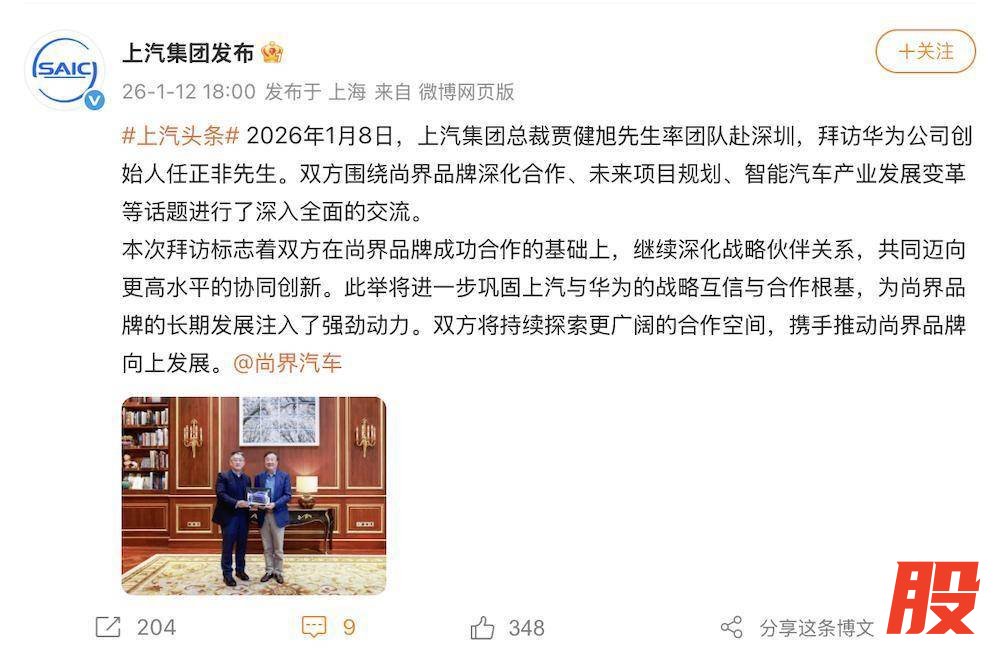 车东西1月13日消息,日前,上汽集团宣布,2026年1月8日,上汽集团总裁贾健旭亲自带队奔赴深圳,拜访了华为公司创始人任正非。