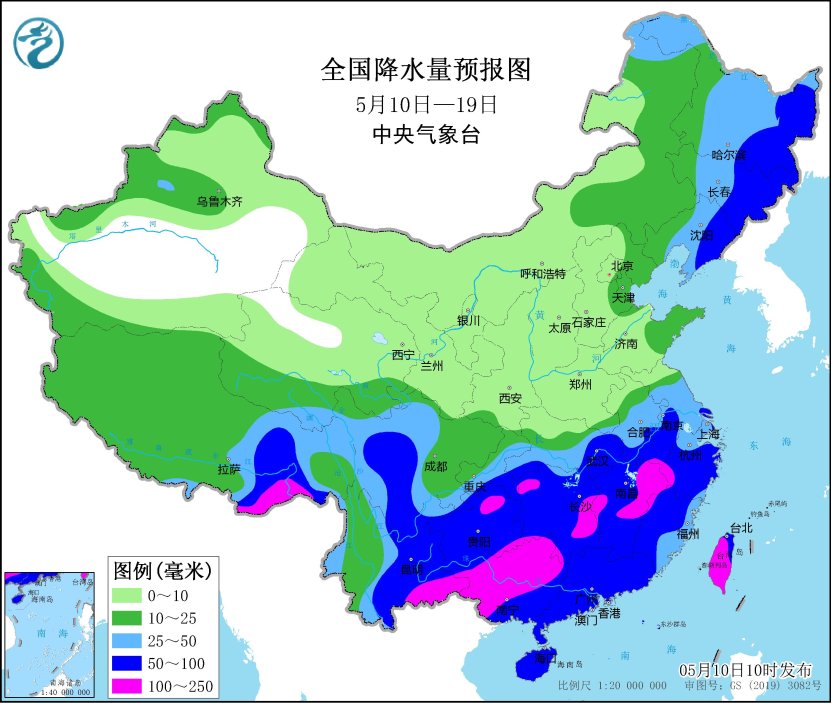 过去10天(4月30日-5月9日),江南南部、华南以及贵州、四川盆地等地累计降水量有50~100毫米,局地超过150毫米,新疆沿天山一带、东北地区东南部累计降水量有20~40毫米,局地超过50毫米,较常年同期偏多,我国其余大部降水接近常年或偏少。